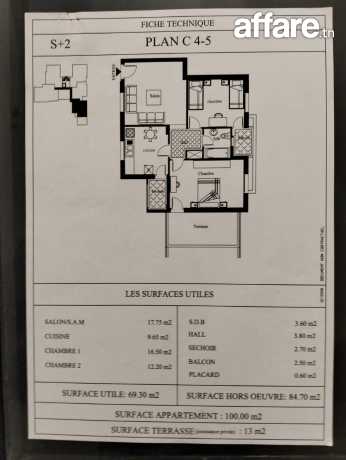 Av app S+2 Cité el Ghazela superficie 100m, 4ème étage, chambre avec terrasse de 13 m, chambre avec balcon, hall+placard, cuisine (éléments+séchoir), salle de bain, chauffage central, accès immeuble et ascenseur par puce, résidence clôturée, surveillée par caméras, l' accès parking extérieur par télécommande.
