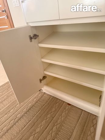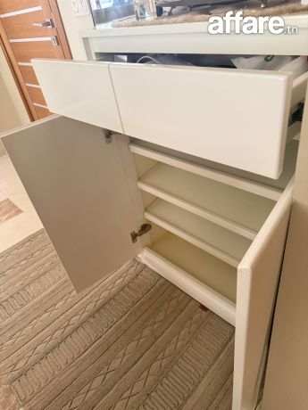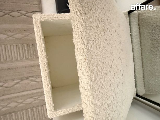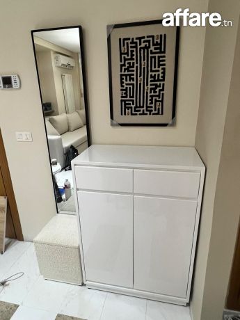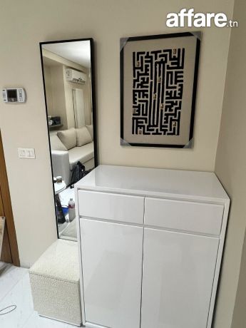 Ensemble moderne composé de : Un grand miroir vertical (hauteur approx. 1m87) Un meuble de rangement laqué blanc avec : 1 tiroir supérieurs 2 portes inférieures Grande capacité de stockage Un pouf/siège intégré en tissu bouclé, idéal pour s’asseoir en mettant ses chaussures Un tableau décoratif format 65 × 46 cm (style géométrique noir) Couleurs neutres, style moderne et minimalisteparfait pour une entrée propre et fonctionnelle. État comme neuf.