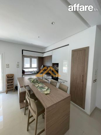 Cuisine ouverte entièrement équipée (hotte, four, réfrigérateur encastré), parfaite pour préparer vos repas en famille ou entre amis.