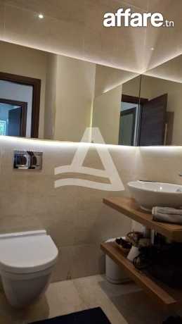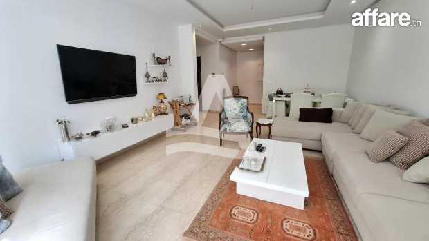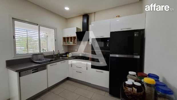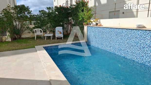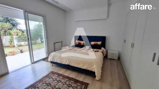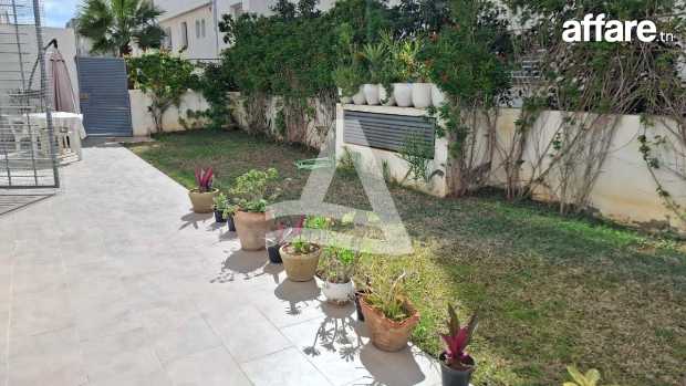 Arcane Jardins de Carthage vous propose la location d'un joli appartement S2 avec piscine et jardin privatif, situé dans une petite résidence calme et sécurisée aux jardins de Carthage Ce dernier se compose d'un spacieux salon salle à manger très lumineux grâce à ses baies vitrées qui donne sur le jardin faisant le tour de l'appartement, d'une cuisine entièrement équipée avec séchoir donnant aussi sur le jardin et la piscine, une salle d'eau invité complète la partie jour. La partie nuit est séparée, abrite deux chambres a coucher équipées de dressing et une salle de bain commune. L'appartement bénéficie d'une entrée indépendante donnant directement sur une belle piscine et un très beau jardin. Il est doté aussi de multiples rangements intégrés, idéal pour une organisation facile. Une place de parking en sous-sol est disponible. L'appartement peut être aussi louer meublé à 4000 dt