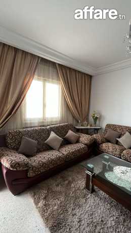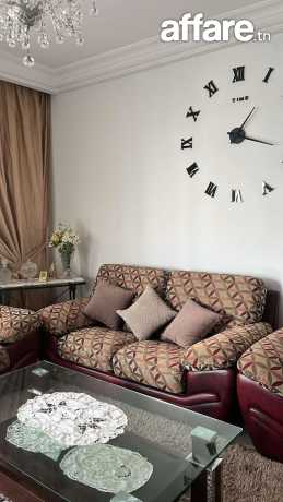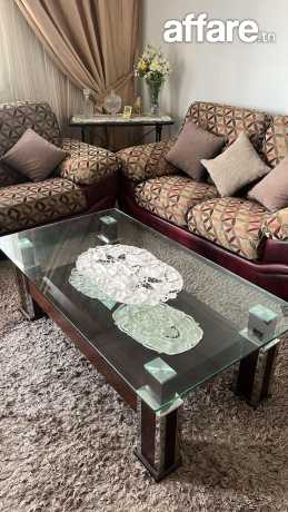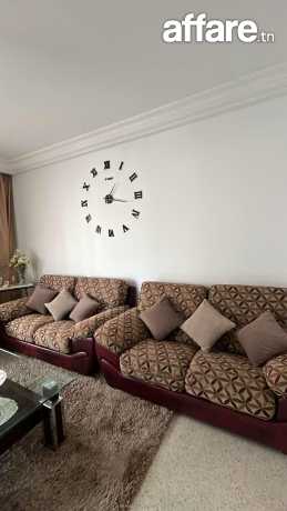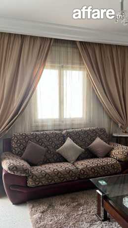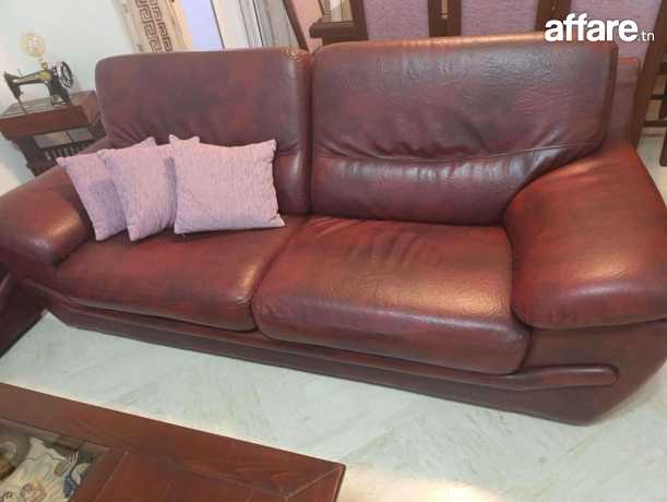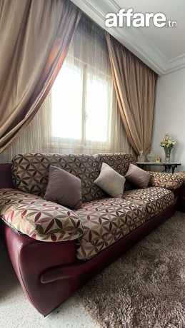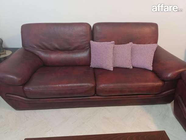 Salon composé de 1 canapé trois places et 2 canapés deux places en semi cuir , couleur Bordeau avec des housses en tissus sur mesure démontables et lavables, avec fermetures , une table basse rectangulaire avec 2 niveaux, robuste de haute qualité, des rideaux assorties sur le salon, rideaux doubles organza et jacquard pour fenêtre et porte fenêtre.