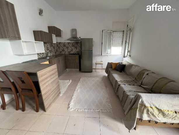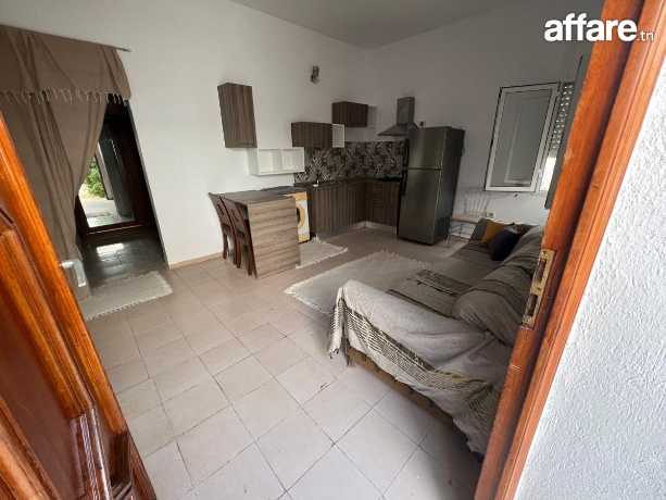Studio meublé à louer dans les hauteurs de riadh el andalous, comprenant une chambre équipée de deux lits et d'un dressing, un petit salon avec espace ouvert intégrant une kitchenette entièrement équipée, une salle d'eau avec douche à l'italienne, ainsi qu'un accès direct à un jardin privé.