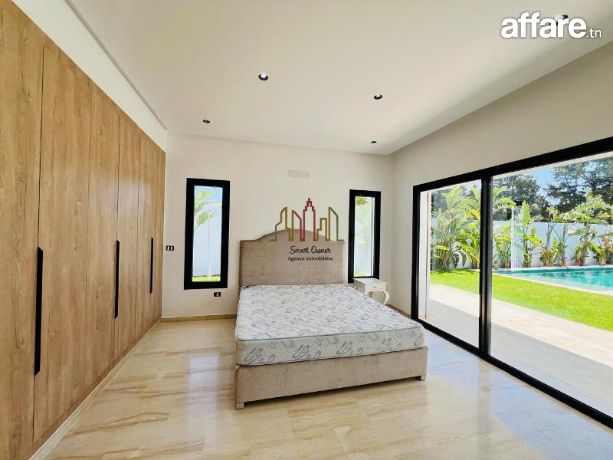 A vendre chez l’agence SMART OWNER immobilière Hammamet, une magnifique villa moderne de plain pieds construite avec des matériaux raffinés, bois noble, sanitaire de qualité, situé dans un quartier bien sécurisé à Hammamet Sud zone Sidi Hammed.