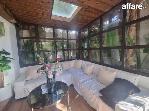 La villa contienne au rez de chaussée, deux grands salons, dont un, contient une salle à manger, un coin de lecture, un jardin d’hiver, une cuisine américaine aménagée et bien équipée et qui donne sur une belle terrasse et sur le beau jardin, comme on trouve aussi une salle de bain avec une douche et une chambre à coucher.