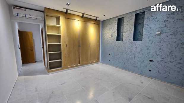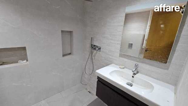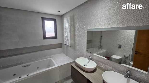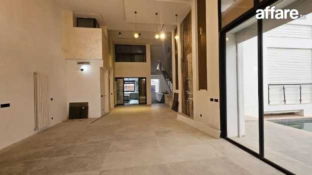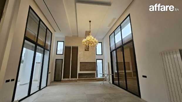 Une grande villa de type S+6 de très haut standing, qui se compose au rez de chaussée d’un vaste salon-salle à manger en double hauteur très lumineux, une suite, une salle d’eau pour les invités et une belle cuisine avec un ilot central.